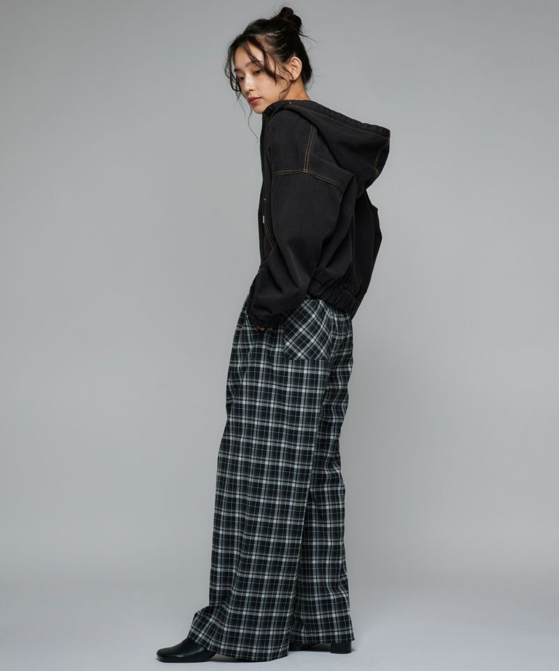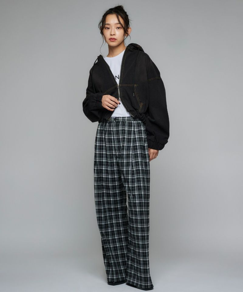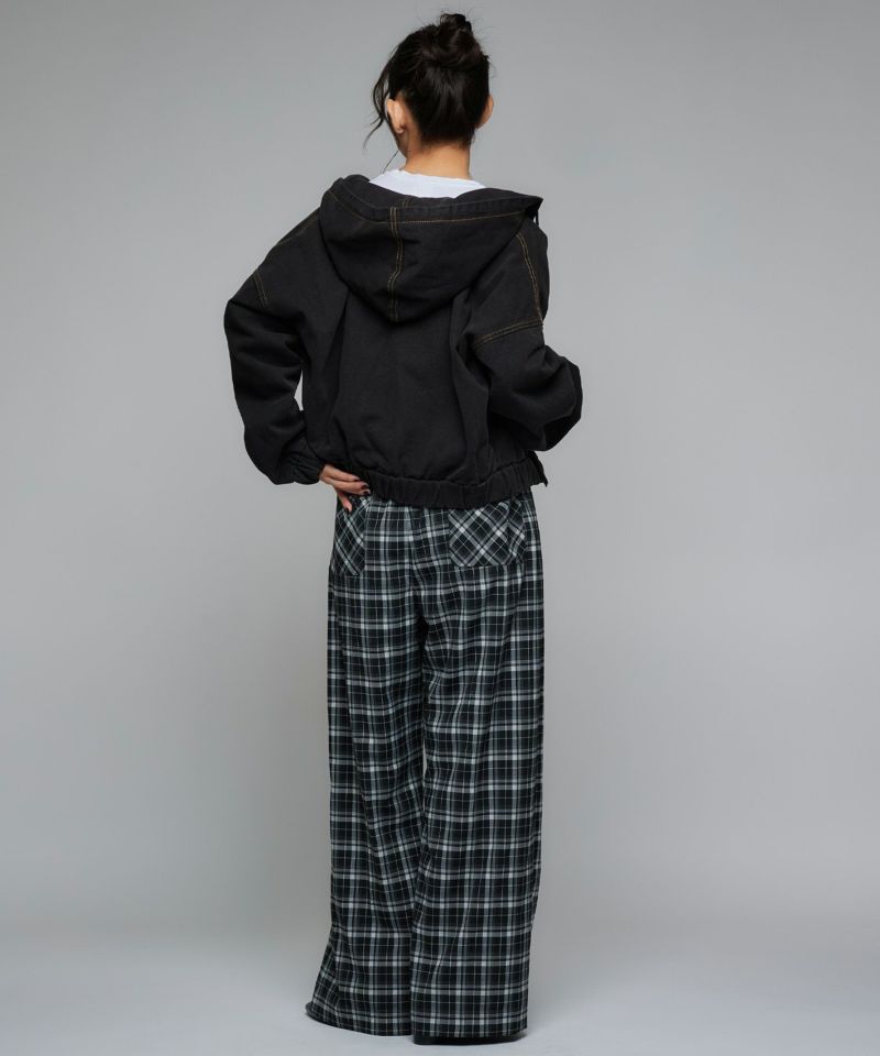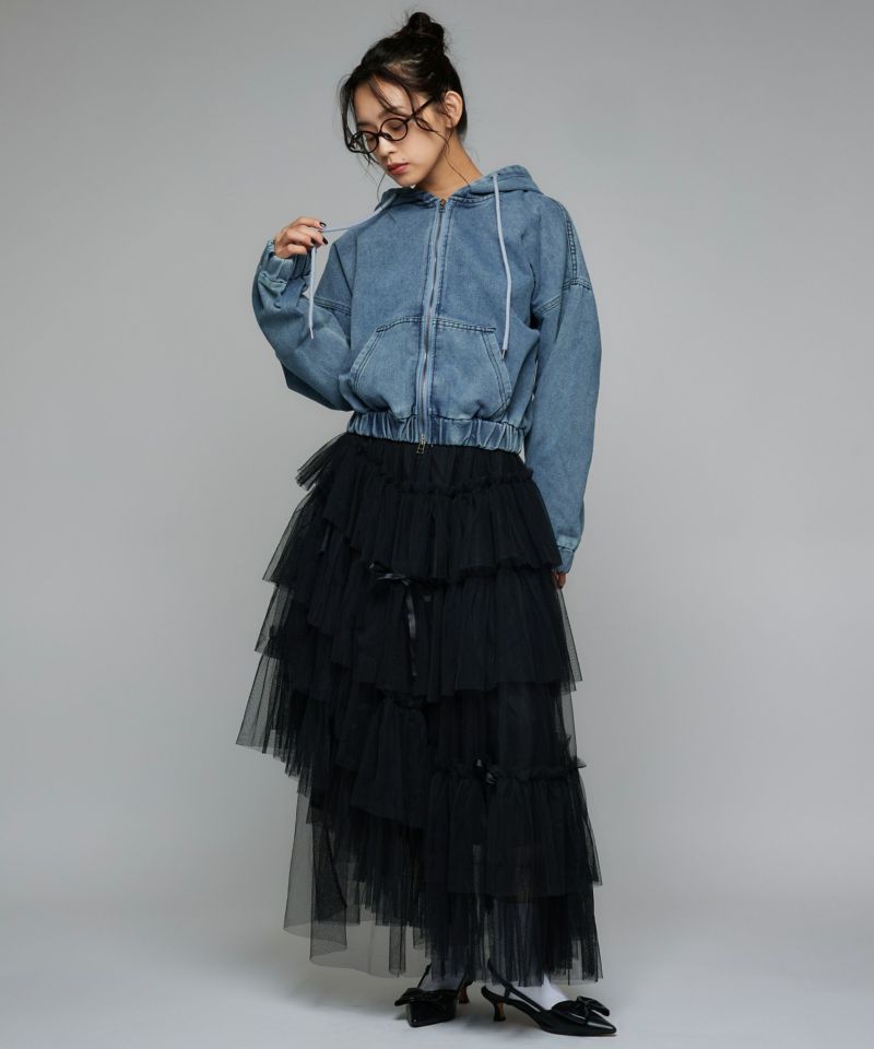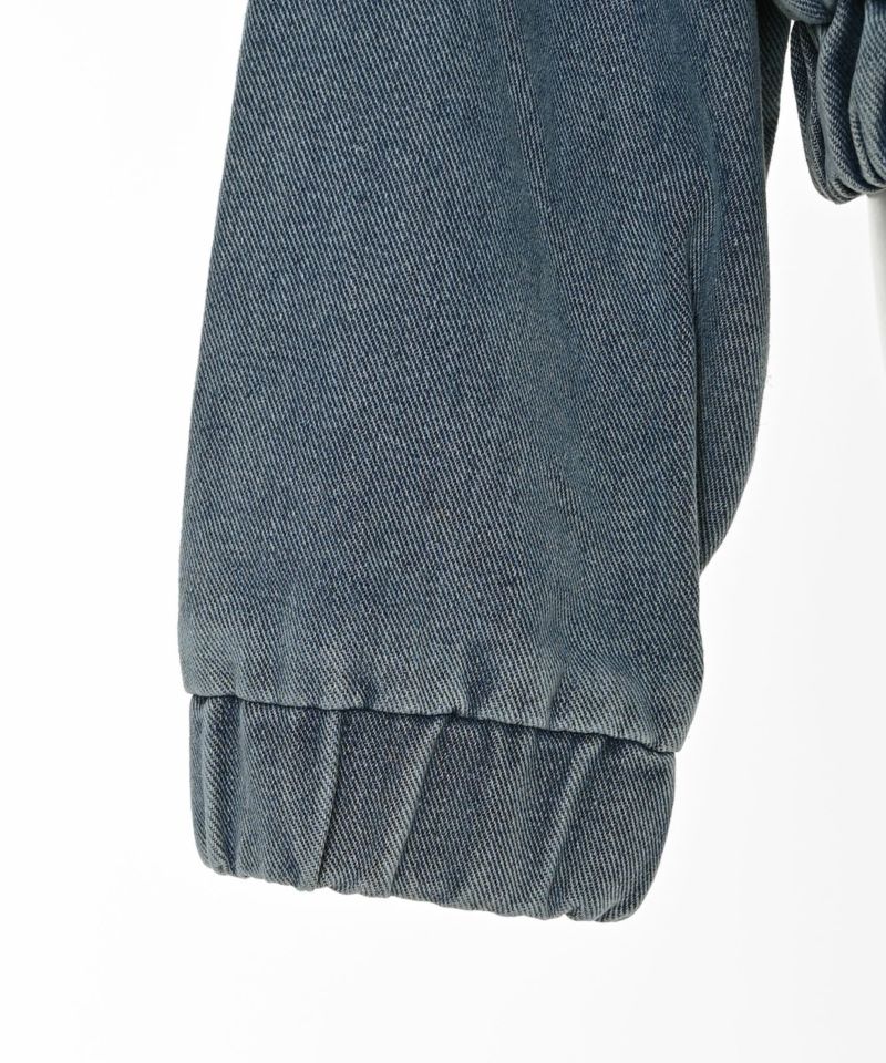 デニム素材で仕立てたジップアップパーカー。ドロップショルダーのゆったりとした袖と、裾に施されたギャザーが生み出す丸みのあるシルエットが魅力です。ショート丈のバランスが全体をコンパクトにまとめ、スタイルアップ効果を演出。フードとフロントジップのディテールがカジュアルな表情を添えつつ、ラフ過ぎない洗練された印象に。