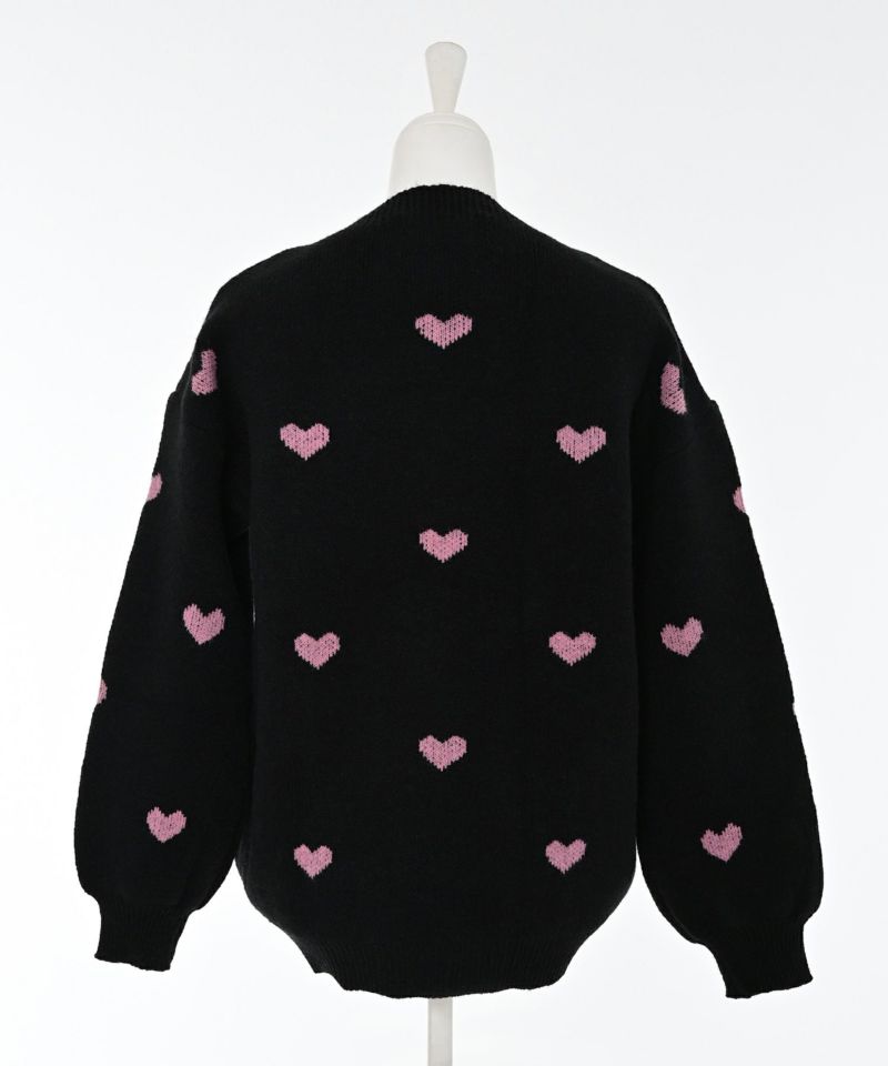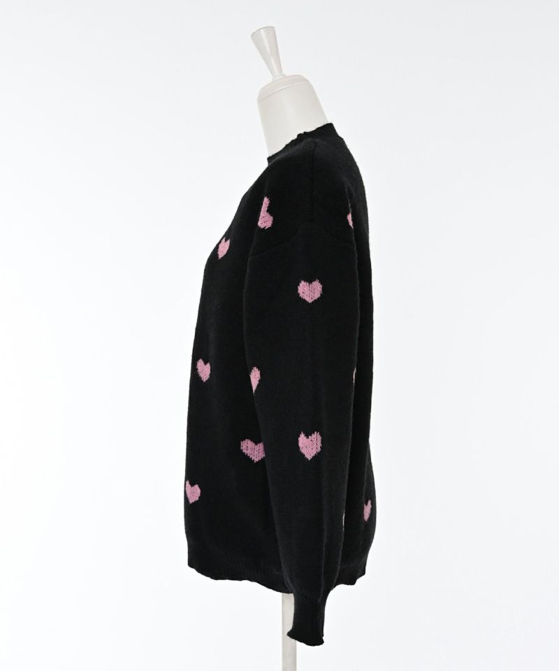 ニット全体に散りばめられたハート柄が目を惹くデザイン。遊び心のあるモチーフながらも、カラーを抑えることで大人っぽく着こなせる一枚です。シーズンスタイルを華やかに彩る主役ニットです。