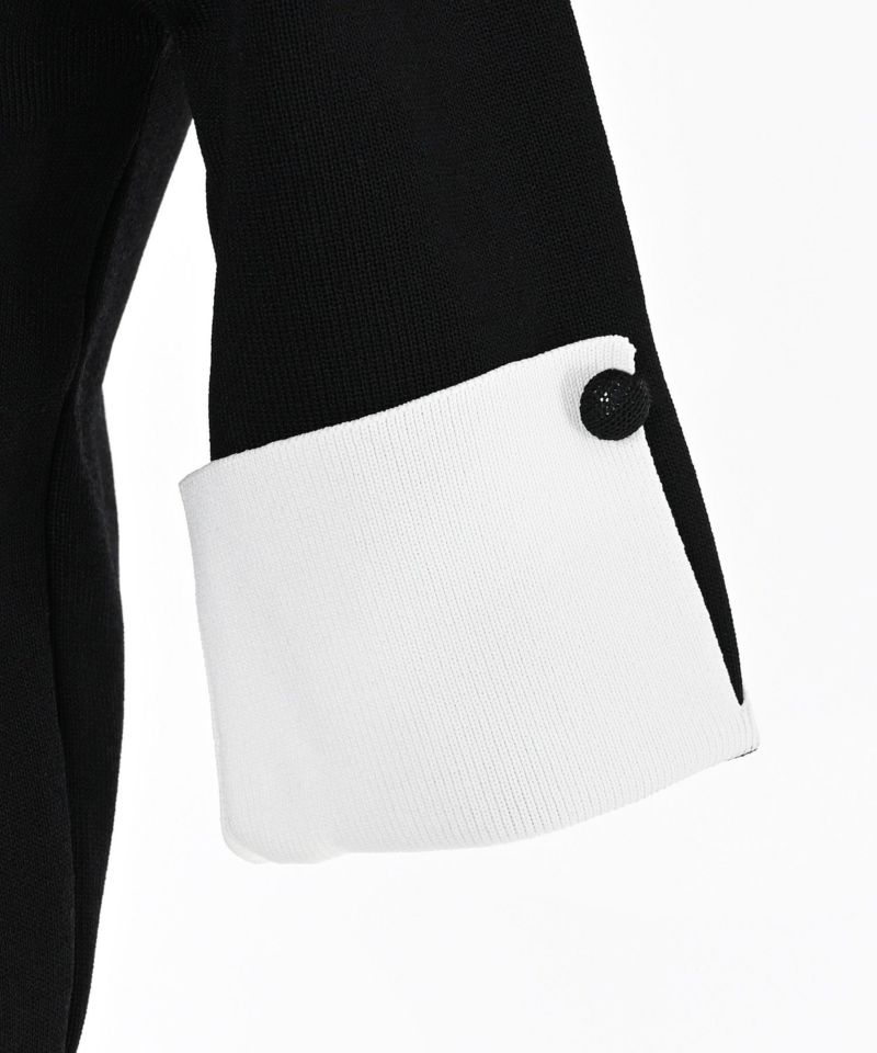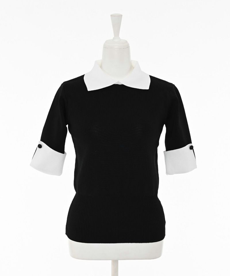 トレンド感のある襟付きデザインの五分袖ニット。袖口はロールアップされ、配色カラーがさりげないアクセントに。スリットやくるみボタンのディテールで、洗練されたメリハリのある着こなしが完成します。