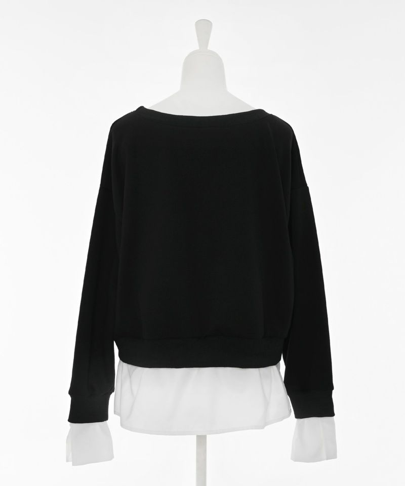 ドッキングされたシャツは袖口と裾部分のみに施されているため、余計なボリュームが出ず、すっきりとしたシルエットで着こなせます。広めに開いたネックラインは、そのまま着用するだけでなく、ワンショルダーやオフショルとしても楽しめ、シーンに合わせて印象を自在に変えられるデザイン。シャツ部分はやや長めの丈感で抜け感を演出しつつ、スウェットはウエスト位置に設定されているため、バランスよくスタイルアップを叶える一枚です。