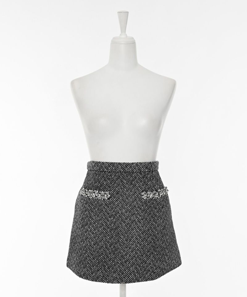 フェイクポケットの縁にあしらわれたビジューが、洗練された輝きを放つスカート。シンプルな中にモードなアクセントを添え、コーディネートを一気に格上げします。