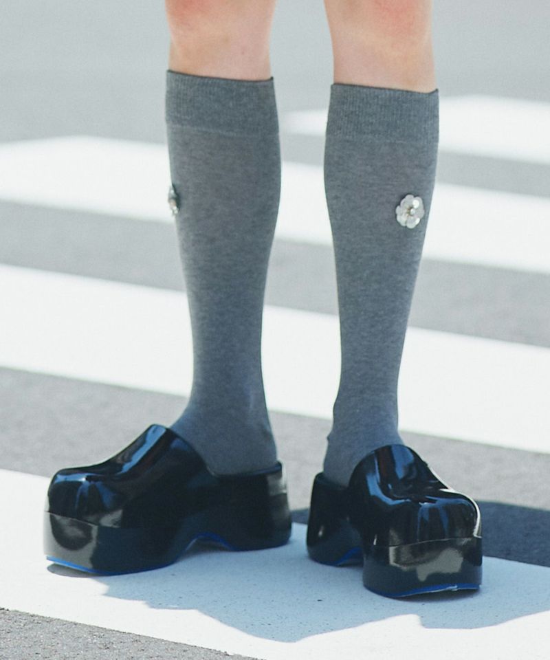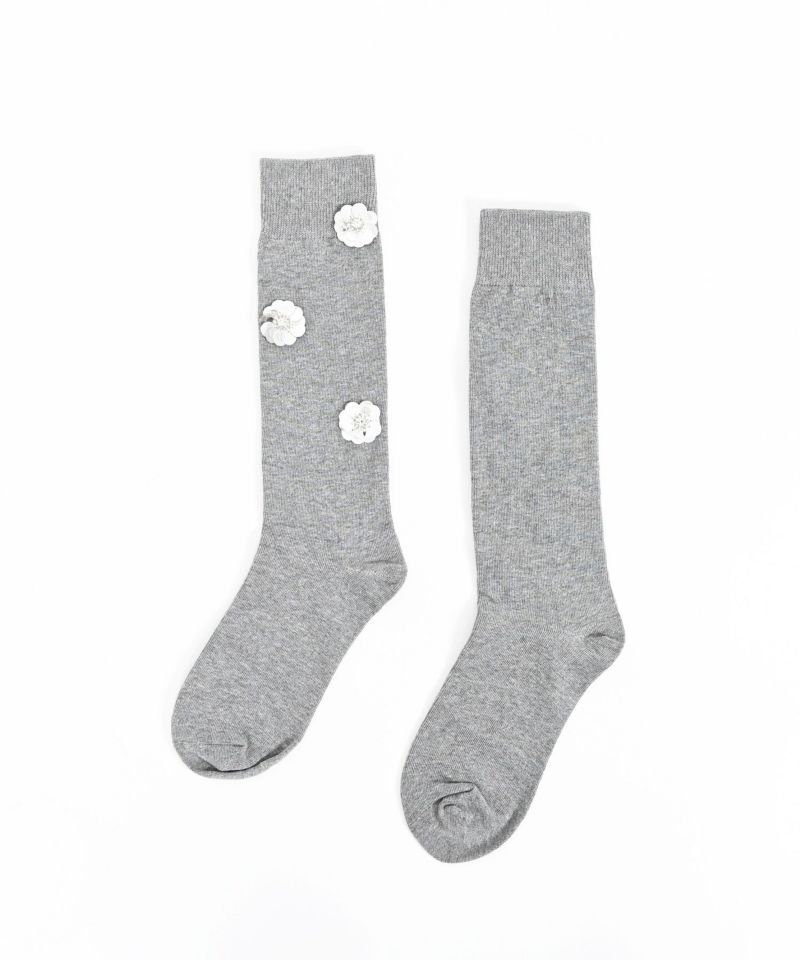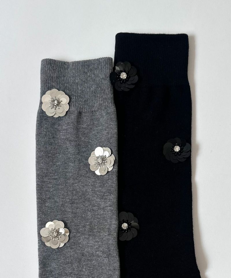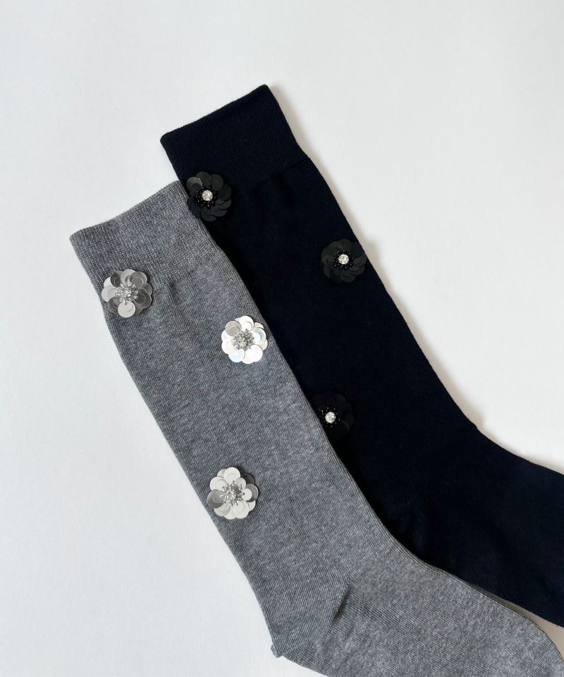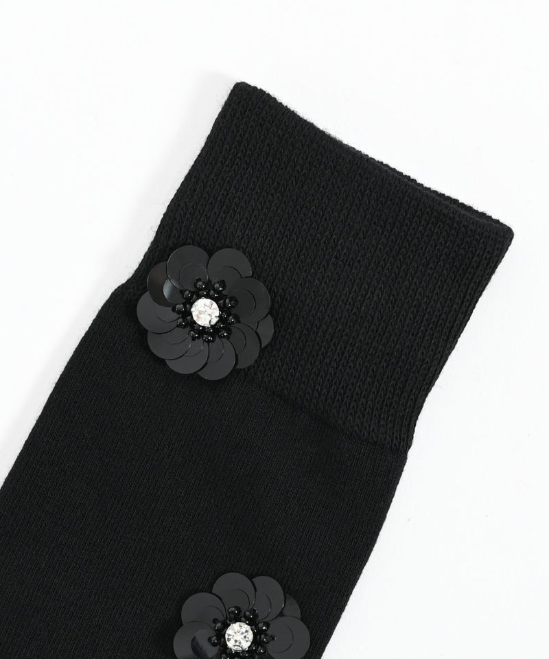 メタル素材のフラワーモチーフを施した存在感あるソックス。スニーカーにもパンプスにも合わせやすく、コーデのアクセントにピッタリ。※洗濯は手洗いを推奨しております。