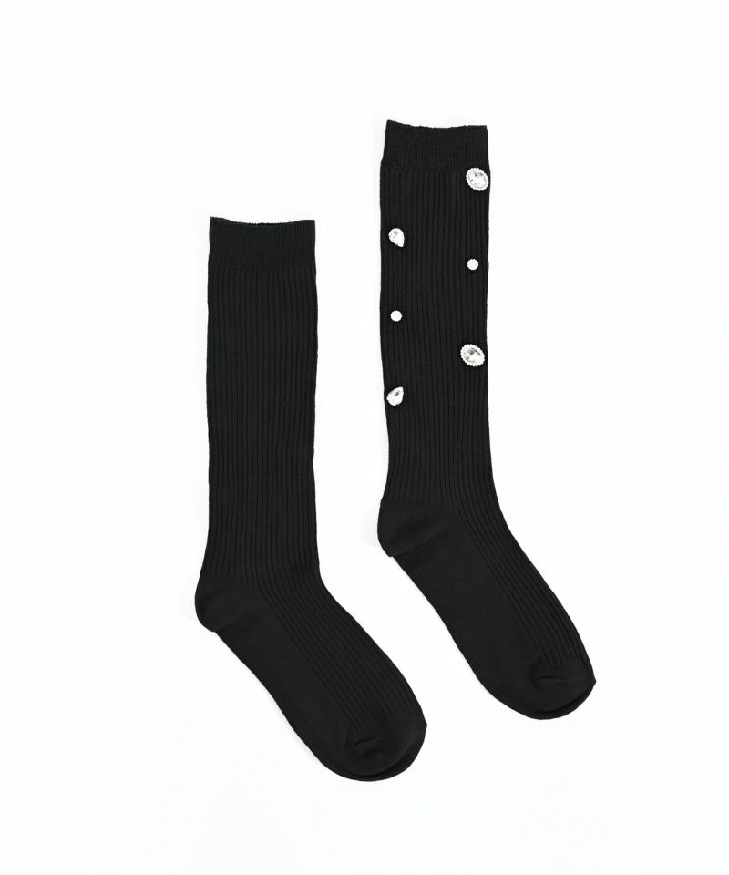 サイズの異なるビジューが輝くラグジュアリーなデザインソックス。着用しやすいさらっとした生地で、伸縮性のあるリブデザイン。足元を華やかにしてくれるアイテム。※洗濯は手洗いを推奨しております。