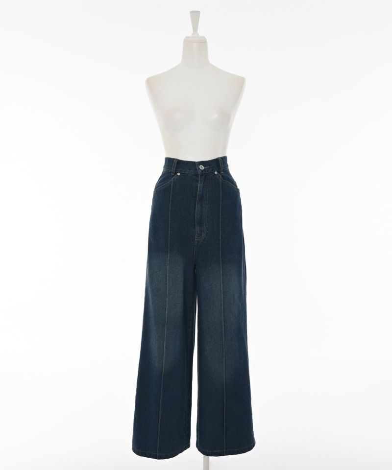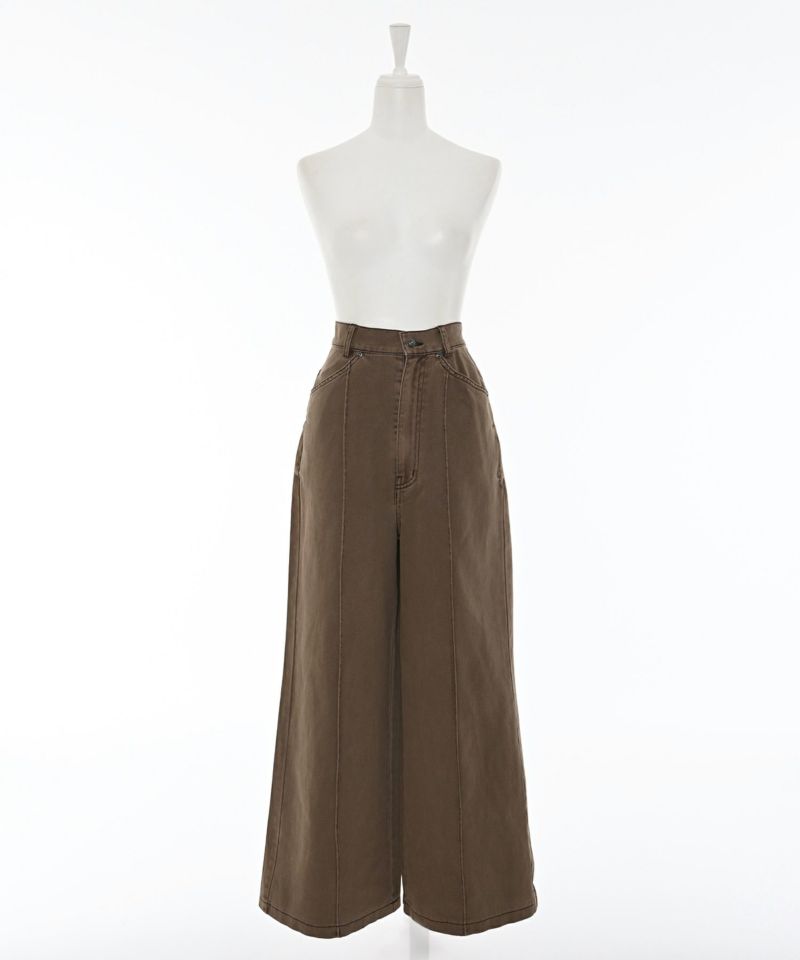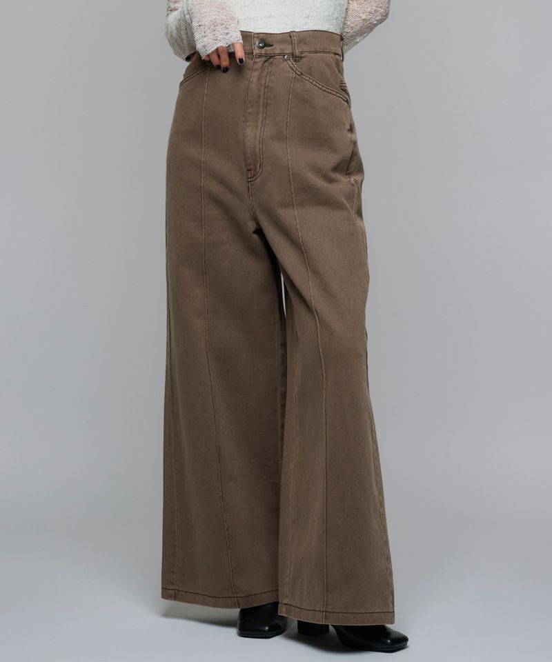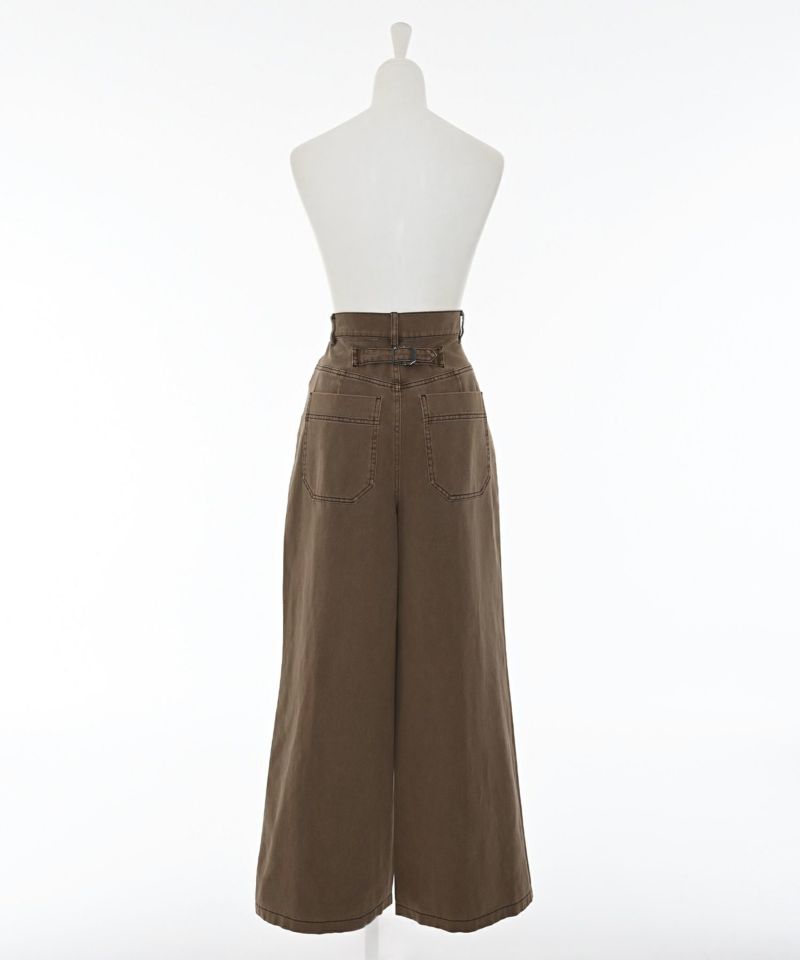 ハイウエストとセンタープレスで脚長効果を叶えるワイドシルエットパンツ。ヒップ部分にはアジャスターを備えており、ご自身の体型に合わせてフィット感を調整できます。ブルーはヴィンテージ加工を施しこなれ感のある仕上がりに、ブラウンは深みのある色合いに黒のステッチを効かせてシックにまとめています。