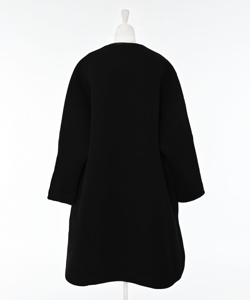 柔らかいダンボールニットを使用したノーカラーコート。丸みを帯びたシルエットとフリルポケットが女性らしさをアピールしてくれる一枚。
