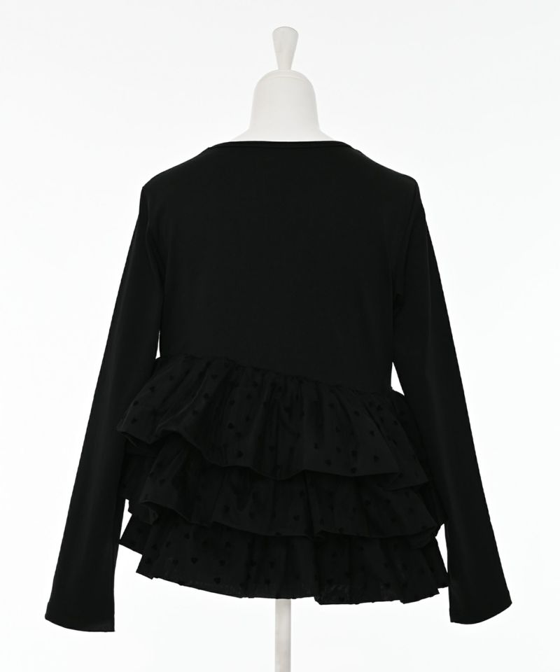 フリル部分が程よいボリューム感を出しつつ、チュールが重なっていることで軽やかな印象に。さりげないアシメデザインが個性をプラスし、フリルが全体的に広がっていることでどこから見ても女性らしいシルエットに仕上がります。シンプルな色味と可愛らしいハートモチーフが華やかさと着やすさを両立してくれる一枚。