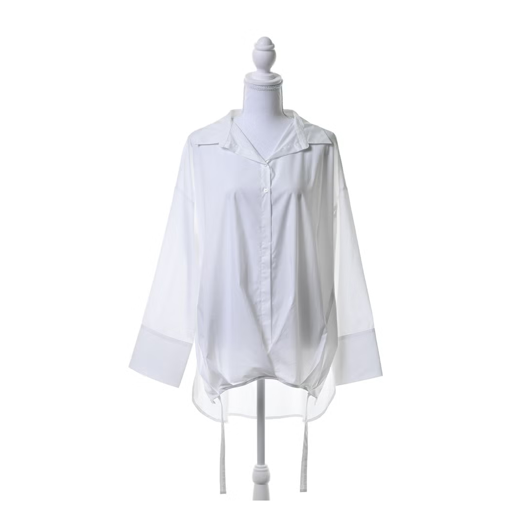 トップスに合わせたバルーンシャツは、裾に施されたタックデザインが特徴で前後差のある着丈が立体的なシルエットを作りシンプルながらも一枚でサマになる存在感に。裾紐のアレンジでバルーンシルエットで着用しても◎