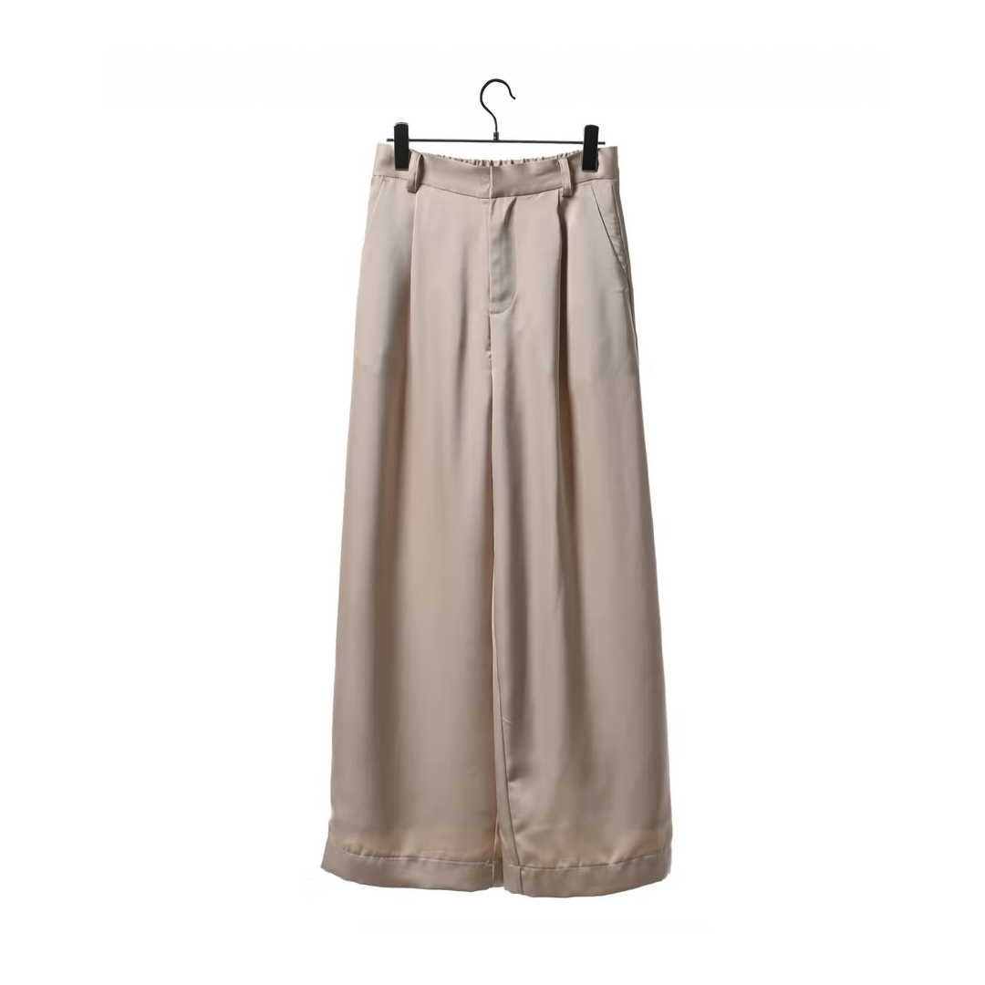 ボトムは落ち感と上品な光沢感のあるサテンワイドパンツを合わせ、全体にリラックス感をプラス。上下ともにゆとりのあるシルエットでまとめながらも、縦のラインを意識することでバランスよく着用いただけます。
