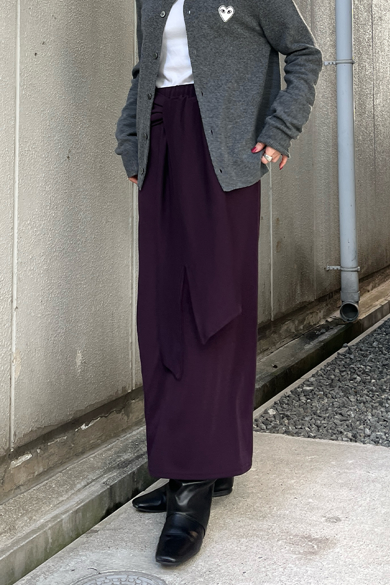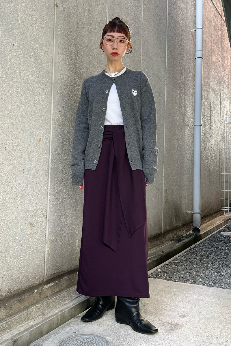 ウエストで結ぶタイデザインが自然に視線を上げ、気になる腰まわりをさりげなくカバー。縦に流れるドレープがIラインを強調し、すっきりとした印象に仕上げてくれます。伸縮性のある素材で動きやすく、長時間の着用でもストレスフリー。パープルのスカートに、グレーのカーディガンを合わせて甘さを抑えた、大人の配色が上級スタイル。