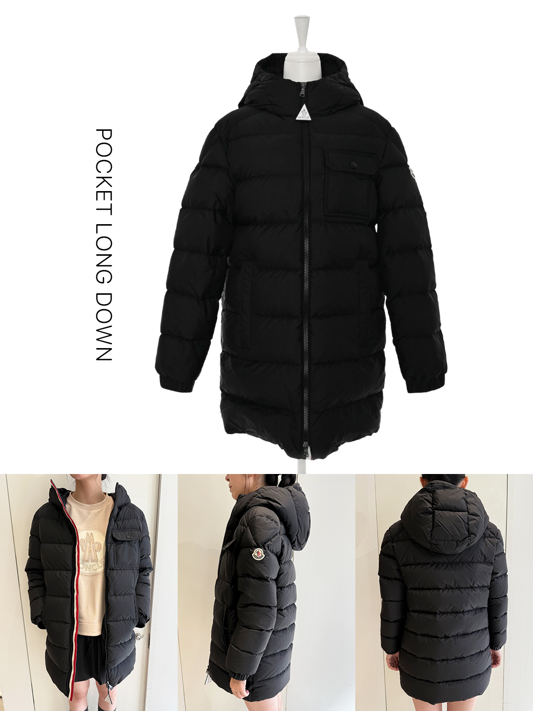 ブラックカラーのロング丈ダウンジャケット。ダブルジップとサイドポケットが機能性を引き立て、フードの刺繍ロゴや袖口のゴム仕様などディテールにもこだわりを感じさせます。羽織った瞬間に感じる軽やかさと包み込む暖かさで、スタイルと快適さの両立を叶える上質な一着です。