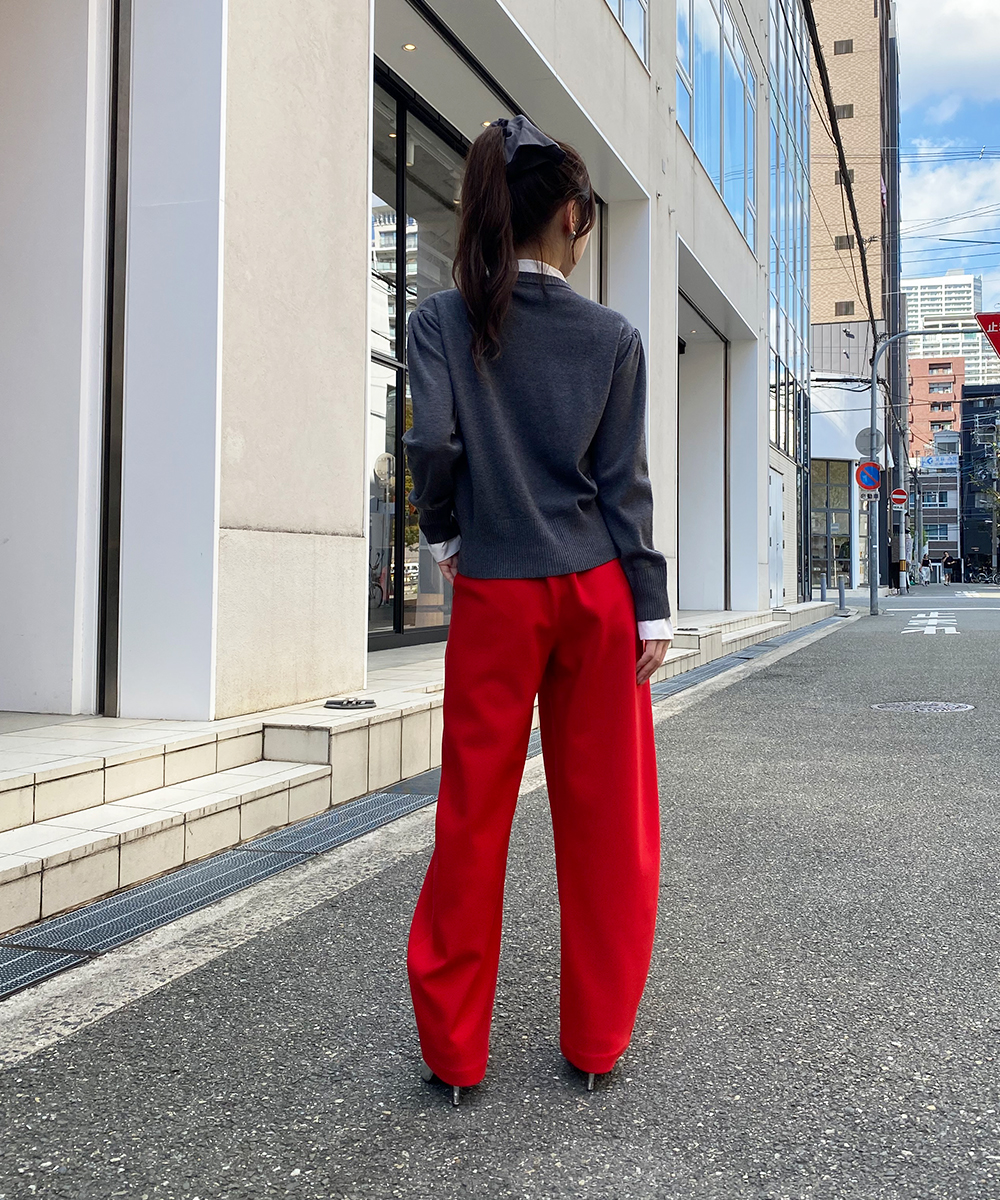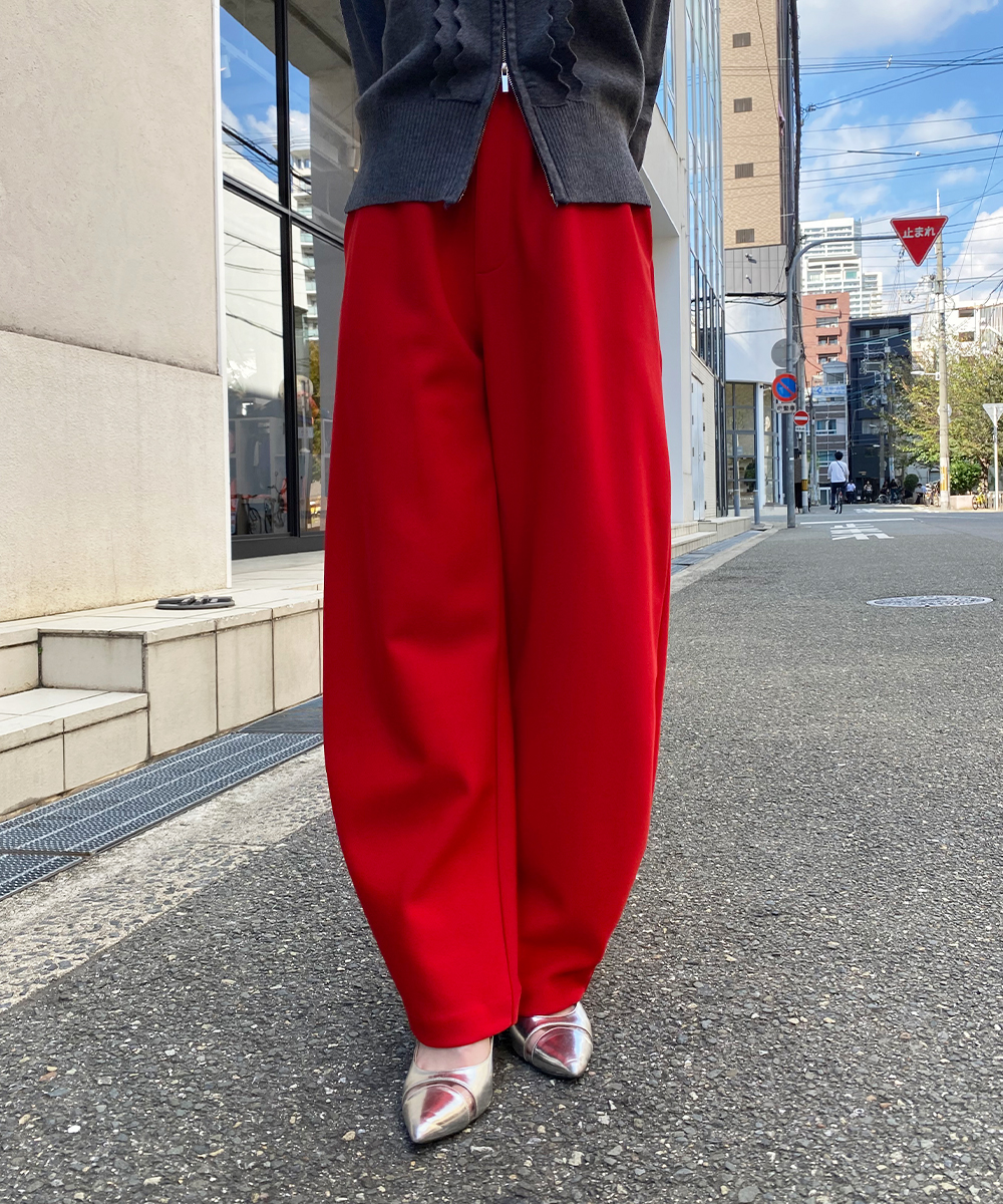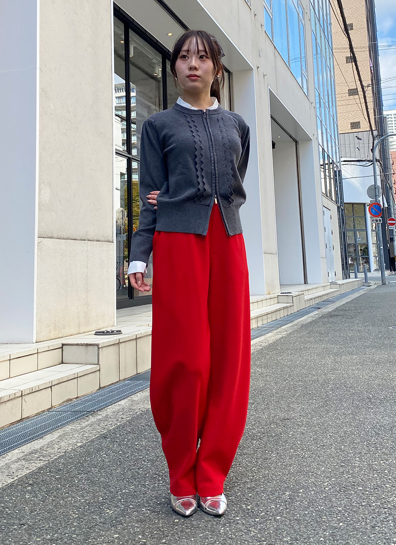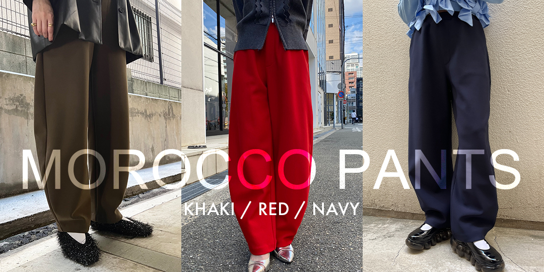 25/AW モロッコパンツ 2025.10.24 TOPICS MOROCCO PANTS 今季トレンドのカーブシルエットが魅力のモロッコパンツ。 ゆるやかなラインが抜け感を生み、 穿くだけで洗練された雰囲気に仕上がる一着。 KHAKI / RED / NAVY 全体的にゆとりを持たせたシルエットが、抜け感のあるリラクシーな雰囲気。ウエストはゴム+紐でサイズ調整が可能。ほどよいハリとストレッチ性のある素材でストレスフリーな履き心地。裏起毛でこれからの防寒アイテムとしても重宝する一着。 STAFF SNAP STAFF : MISAKI 169cm モロッコパンツ / カーキ レザーハーフジャケット / ブラック タートルニット(Courrèges) / ブラック フリンジフラットシューズ / ブラック STAFF PAGE STAFF : MIKU 155cm モロッコパンツ / レッド レースジップカーディガン / グレー スクエアシュシュ / グレー STAFF PAGE STAFF : CHIRO 163cm モロッコパンツ / ネイビー リボンニットカーディガン / ブルー シューズ(grounds) / ブラック STAFF PAGE LOOK ITEM PAGE