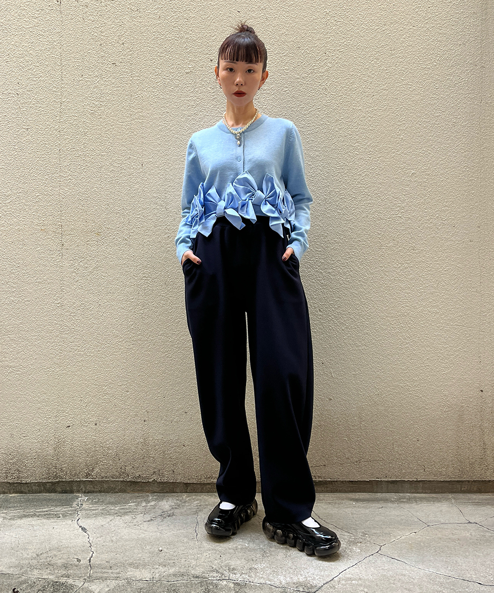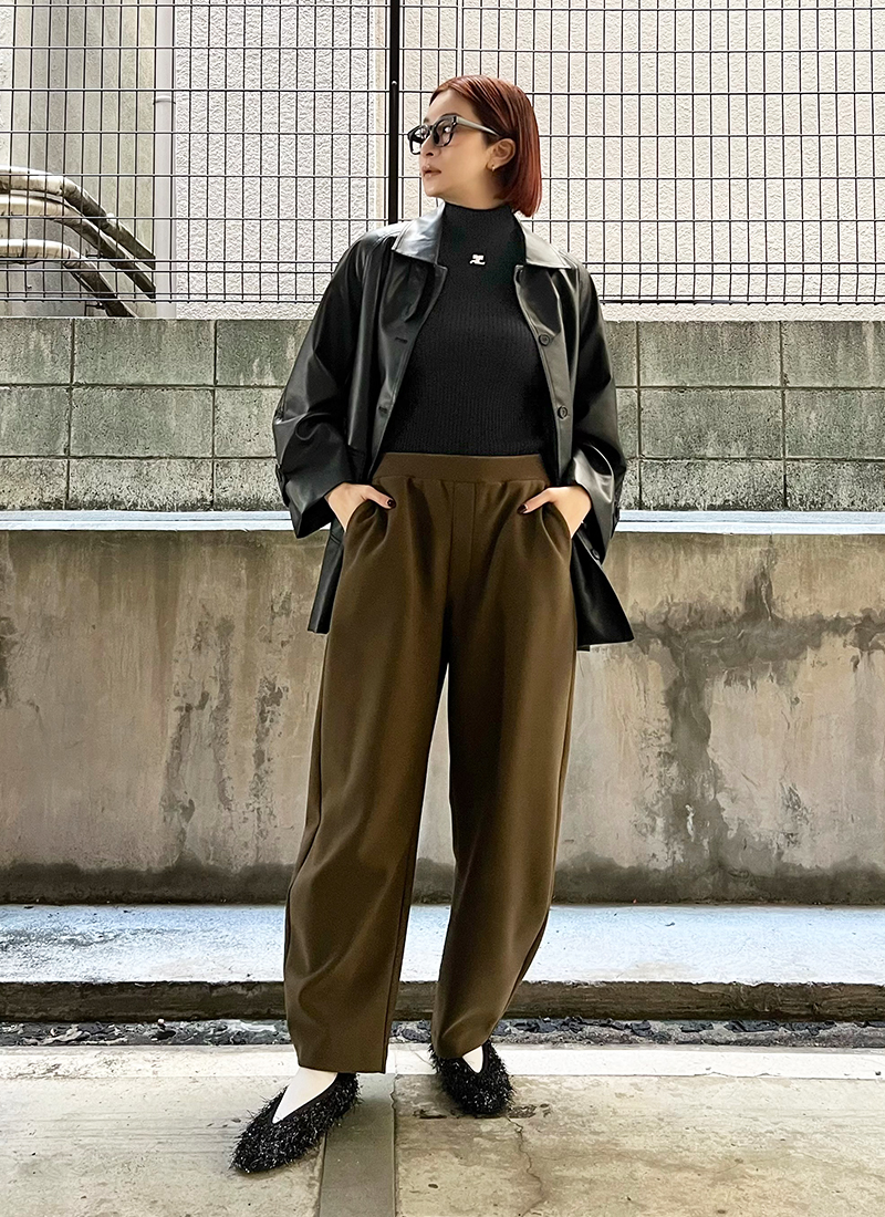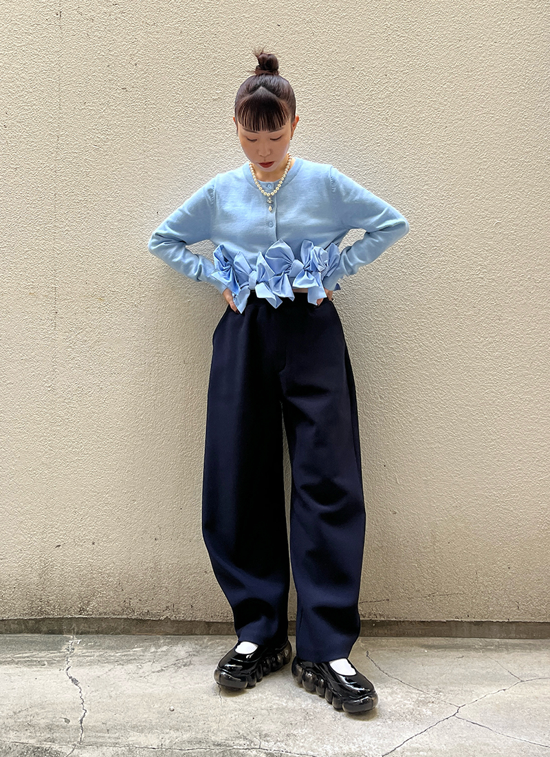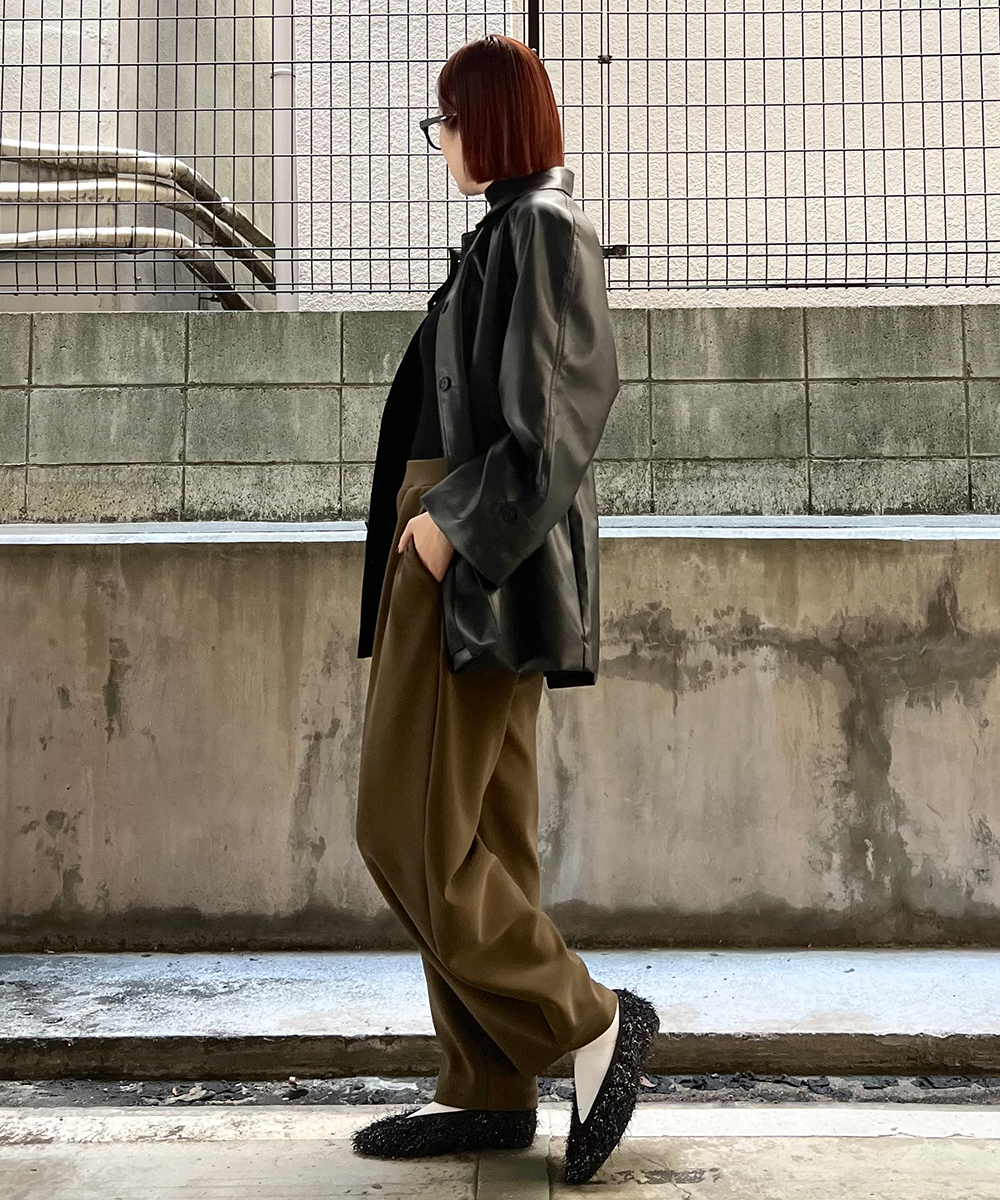 25/AW モロッコパンツ 2025.10.24 TOPICS MOROCCO PANTS 今季トレンドのカーブシルエットが魅力のモロッコパンツ。 ゆるやかなラインが抜け感を生み、 穿くだけで洗練された雰囲気に仕上がる一着。 KHAKI / RED / NAVY 全体的にゆとりを持たせたシルエットが、抜け感のあるリラクシーな雰囲気。ウエストはゴム+紐でサイズ調整が可能。ほどよいハリとストレッチ性のある素材でストレスフリーな履き心地。裏起毛でこれからの防寒アイテムとしても重宝する一着。 STAFF SNAP STAFF : MISAKI 169cm モロッコパンツ / カーキ レザーハーフジャケット / ブラック タートルニット(Courrèges) / ブラック フリンジフラットシューズ / ブラック STAFF PAGE STAFF : MIKU 155cm モロッコパンツ / レッド レースジップカーディガン / グレー スクエアシュシュ / グレー STAFF PAGE STAFF : CHIRO 163cm モロッコパンツ / ネイビー リボンニットカーディガン / ブルー シューズ(grounds) / ブラック STAFF PAGE LOOK ITEM PAGE