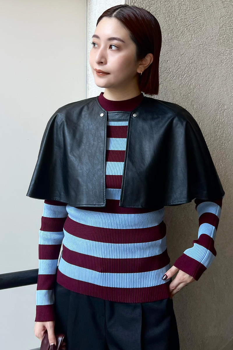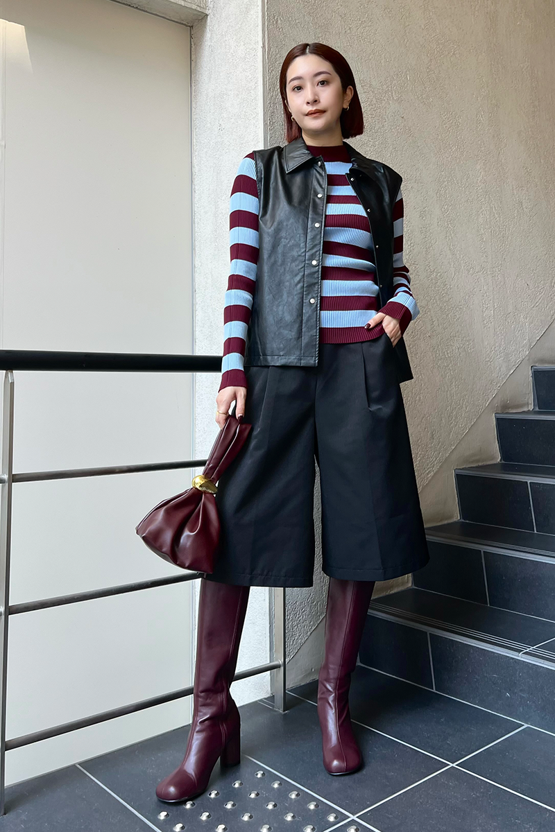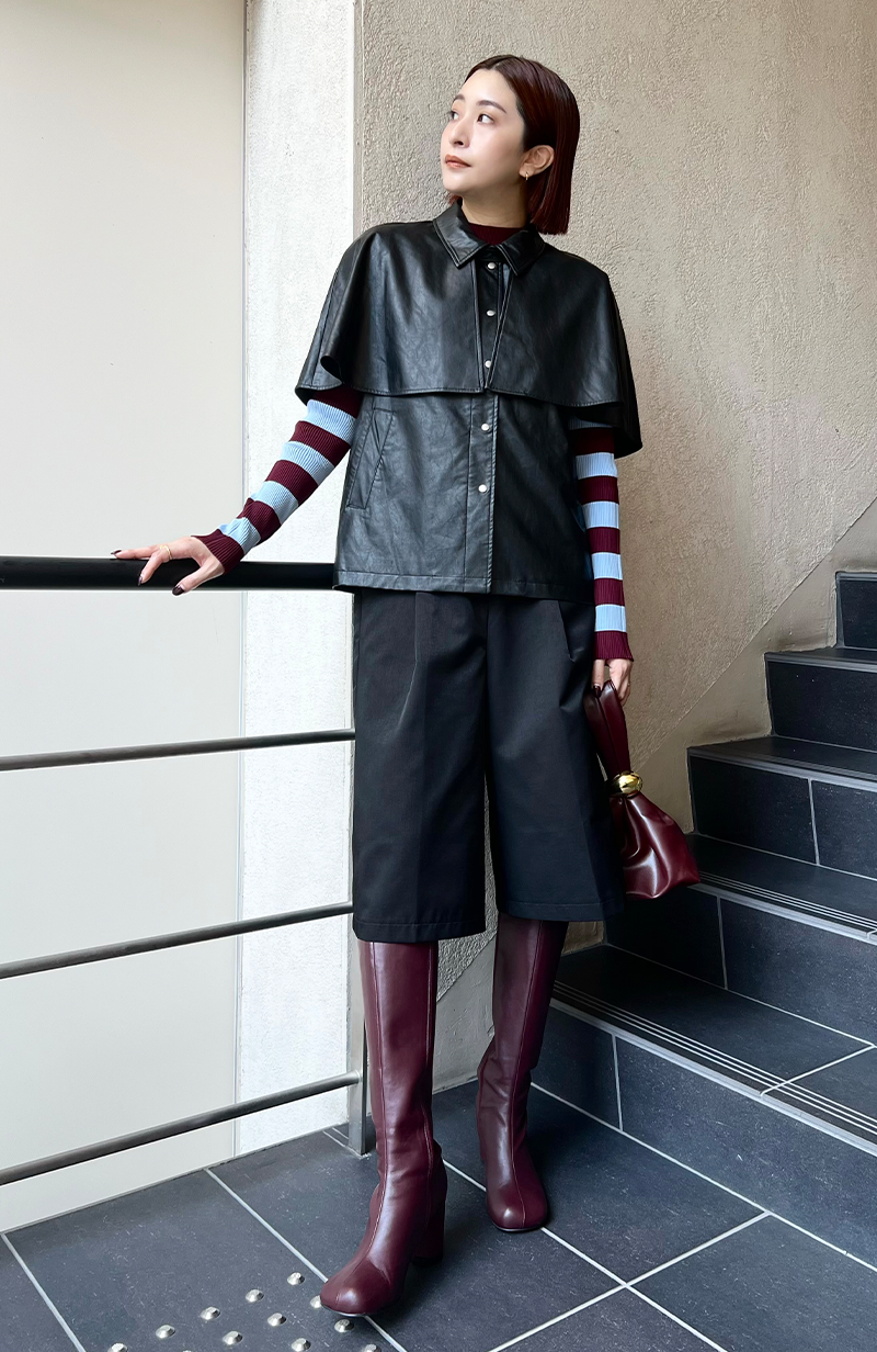 ボーダーニットの遊び心をレザーケープでモードに昇華。 ハーフパンツとロングブーツの組み合わせが縦ラインを強調し、スタイルアップも叶える大人のレイヤードスタイル。 さらに、ボーダーのバーガンディーとブーツ・バッグのカラーをリンクさせることで、統一感のある洗練された印象に。