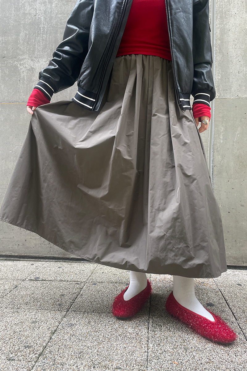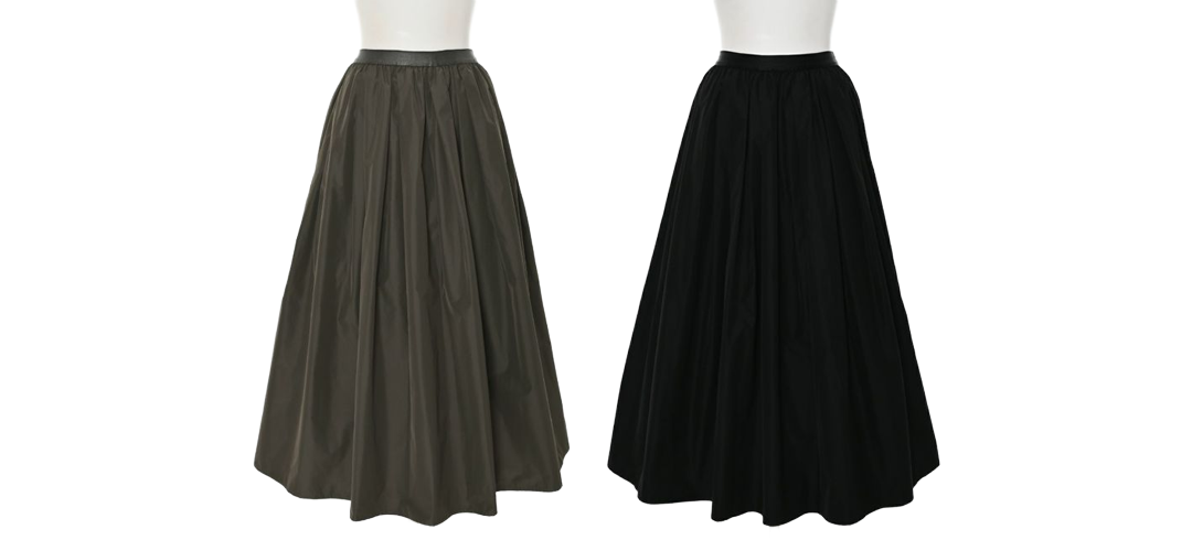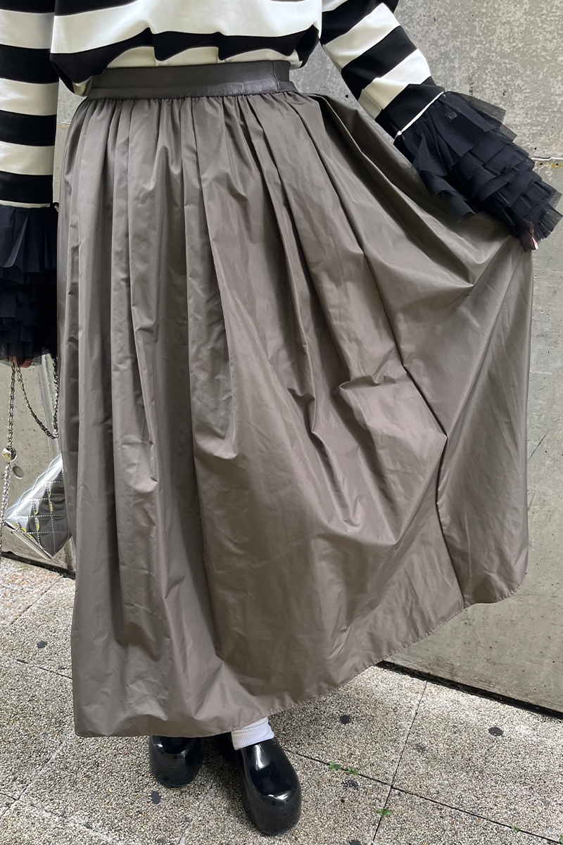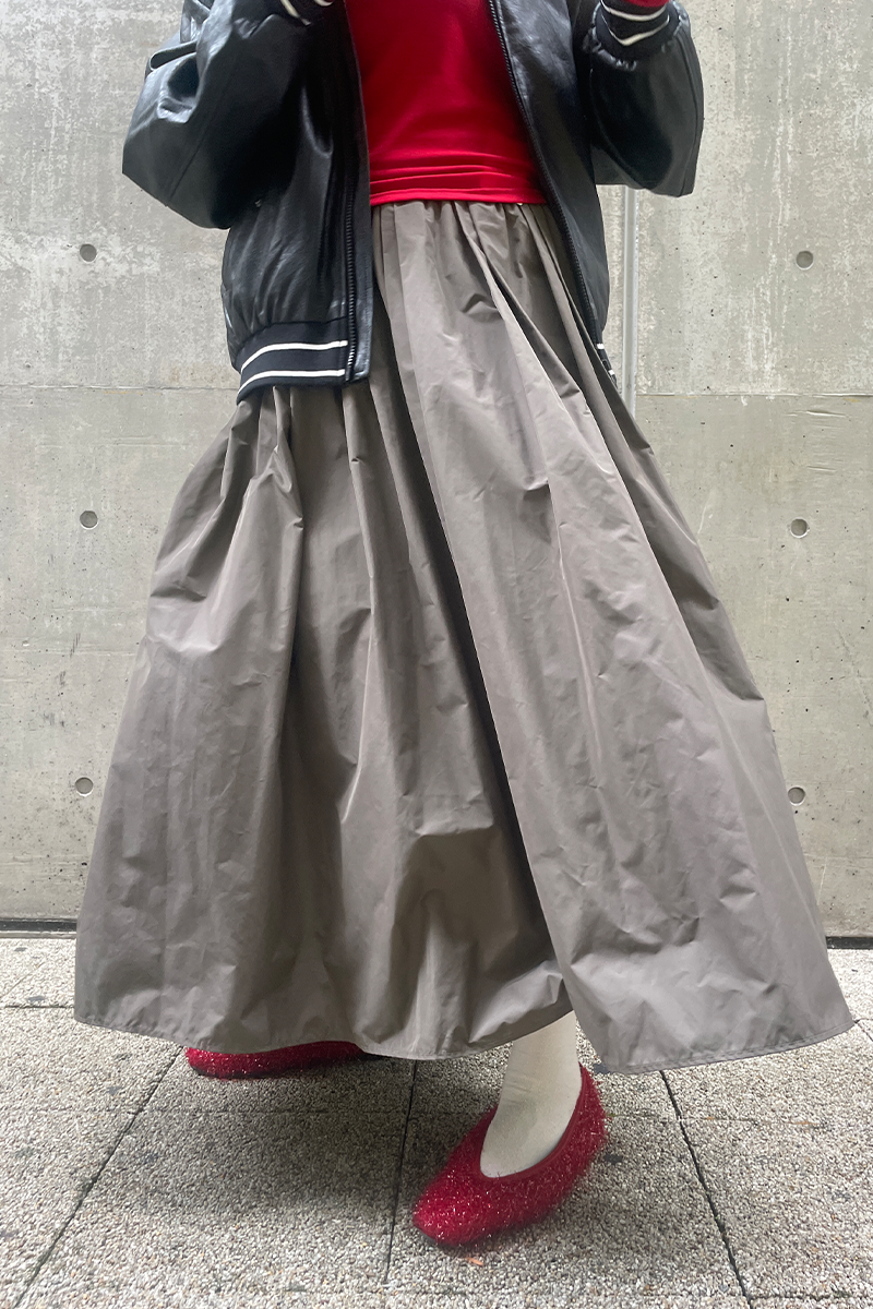 中にチュールを仕込むことで自然なボリュームをキープし、歩くたびに軽やかな動きが生まれます。