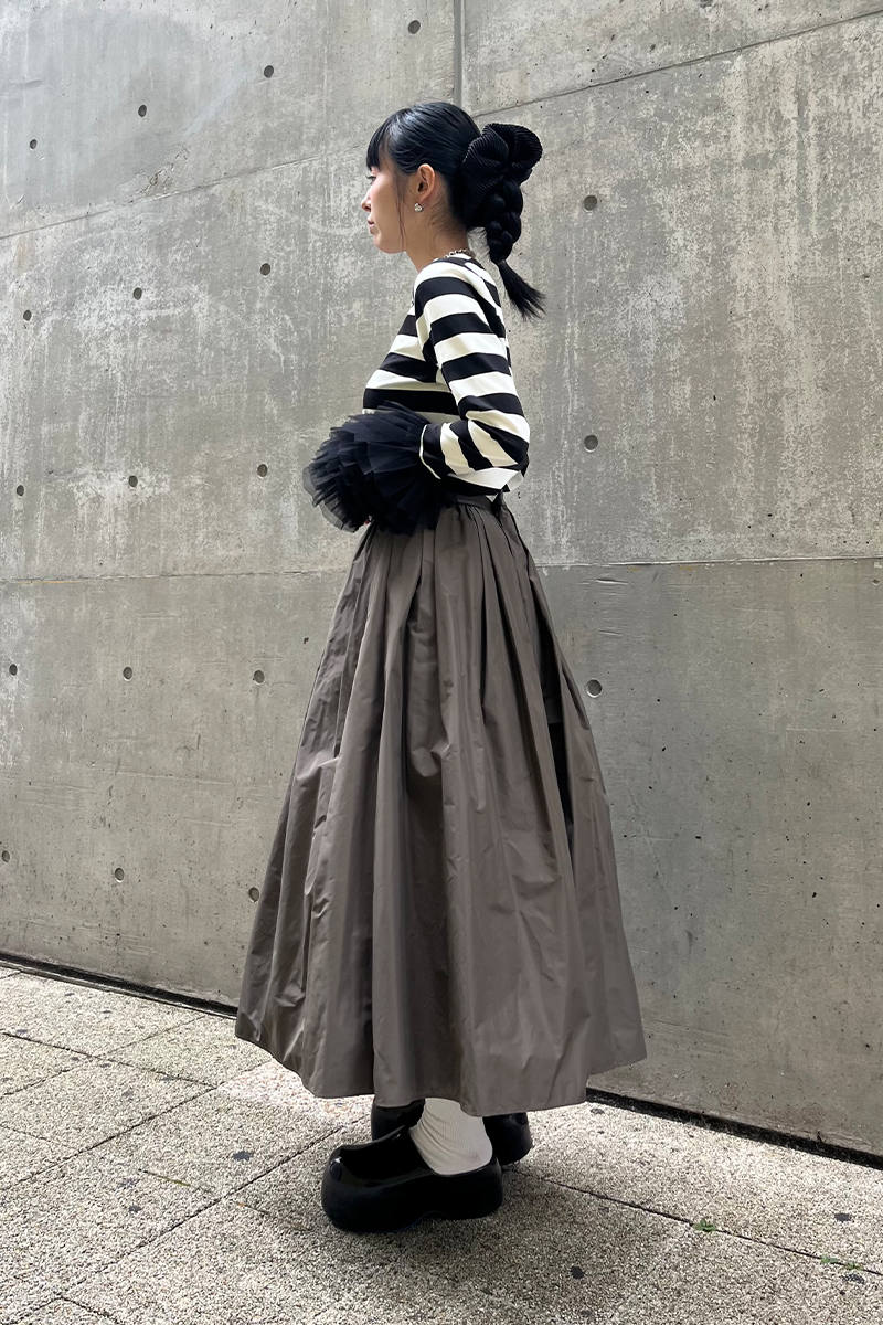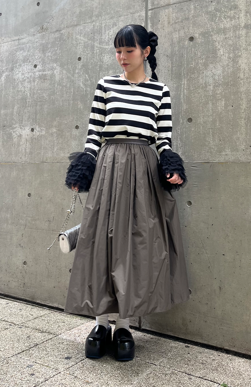 ボリューム感のあるフレアスカートを主役に、モードなボーダートップスで抜け感をプラス。 歩くたびにふんわりと揺れるシルエットが女性らしさを引き立て、袖のチュールがスタイリングに華やぎを添える大人フェミニンな着こなし。