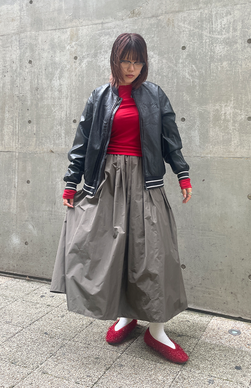 N°21のレザーブルゾンで甘さを引き締め、モードなエッセンスを加えた大人カジュアルスタイル。鮮やかなレッドのトップスとシューズが全体にアクセントを効かせ、存在感のあるエッジィなスタイリングが完成。