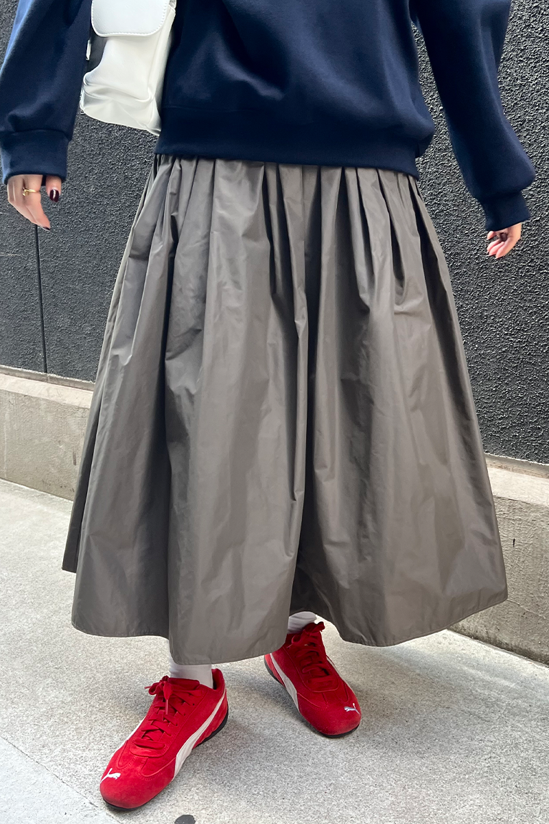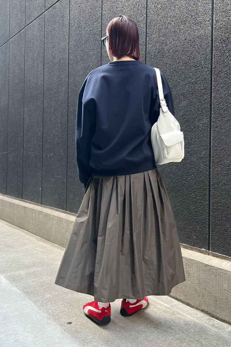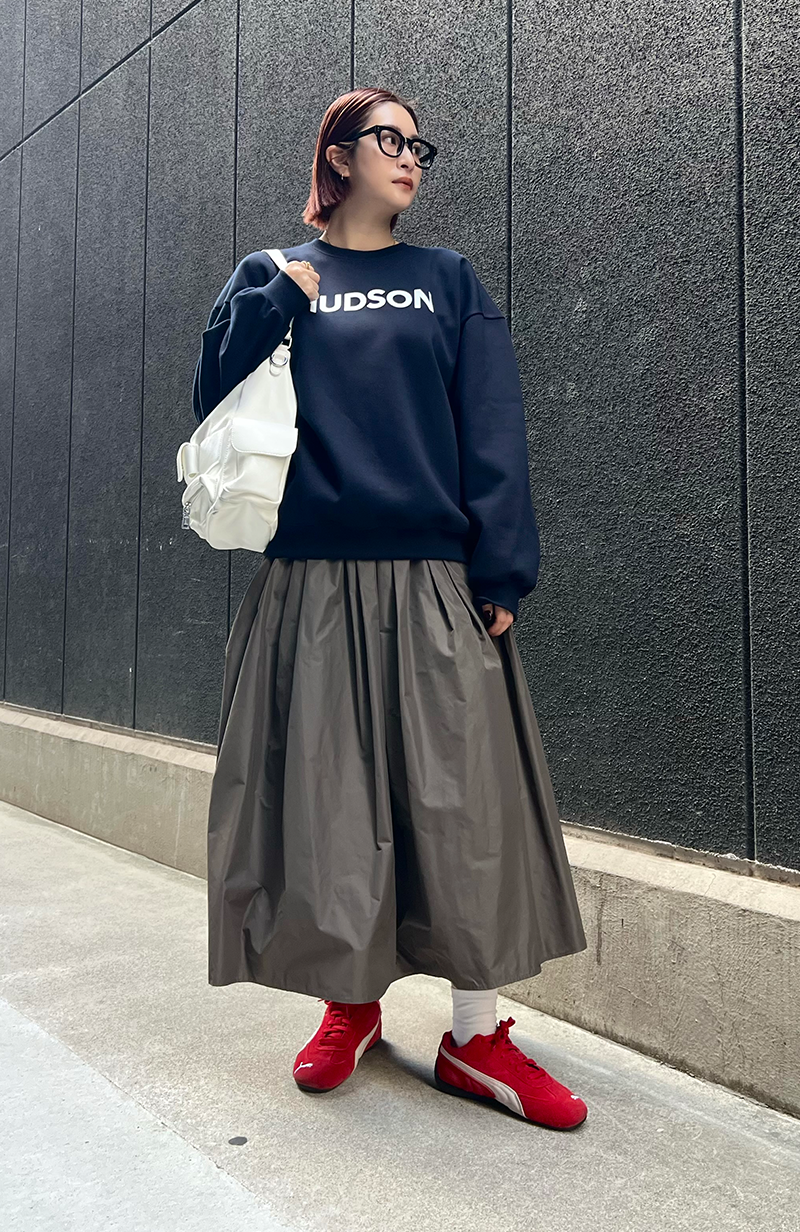 ボリュームスカートの女性らしさに、ロゴスウェットとスニーカーでストリートエッセンスをプラス。 カジュアルとフェミニンの絶妙なミックスが、都会的な抜け感を演出するスタイリング。 さらに、足元のレッドがルック全体にアクセントを添え、存在感のあるモードな印象へと引き上げます。