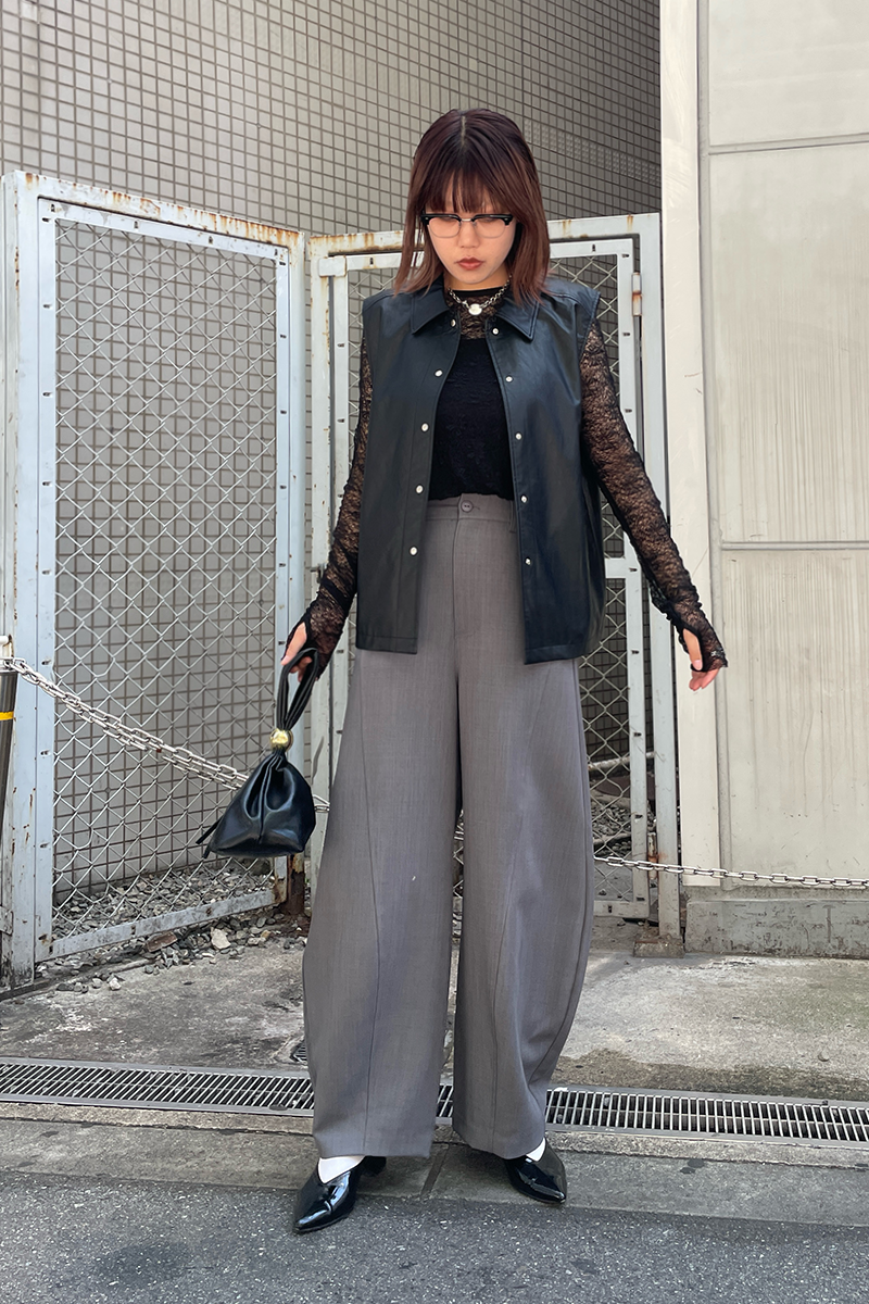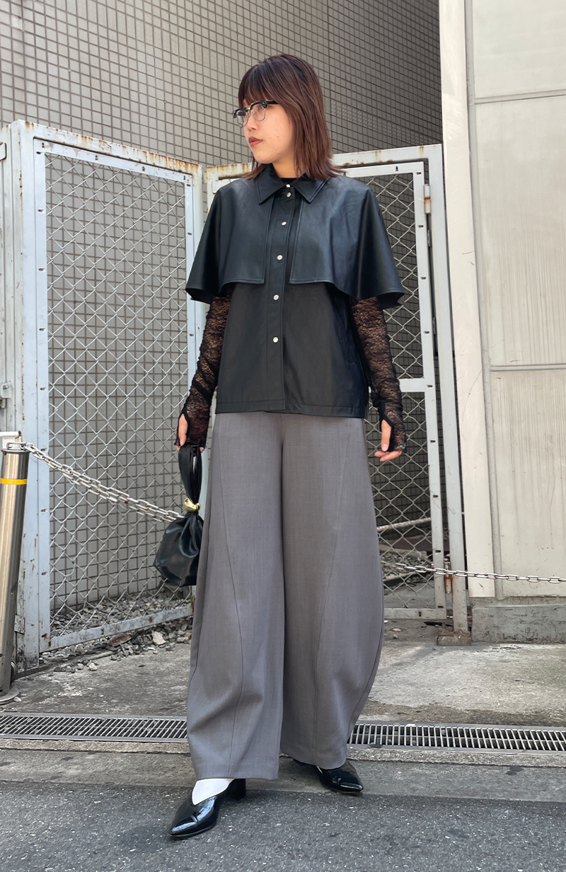 繊細なレーストップスにレザーの重厚感を重ねて、甘さを抑えた大人の抜け感スタイル。 ボリュームシルエットのキャロットパンツが全体にリラックスムードを加え、強さと柔らかさを共存させたモードなレイヤードが完成。