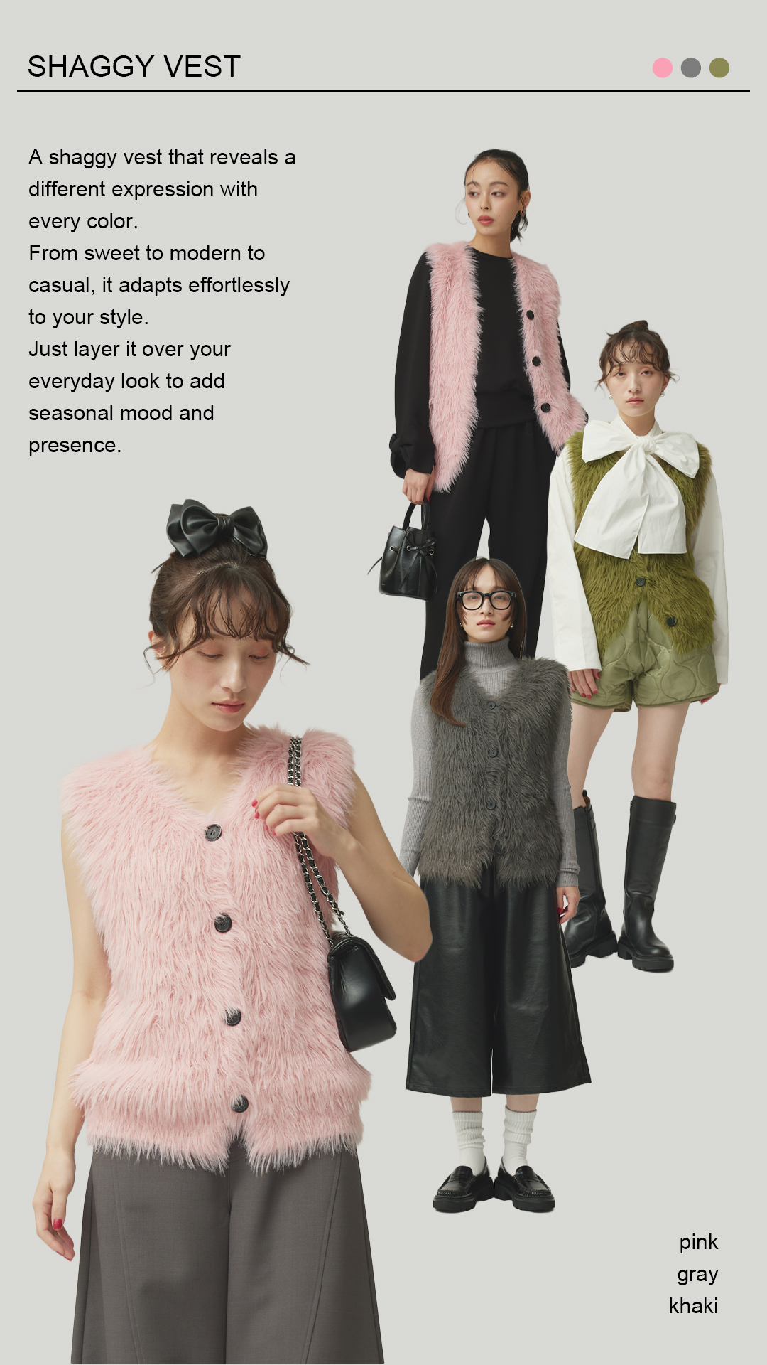 カラーごとに異なる表情を楽しめるシャギーベスト。