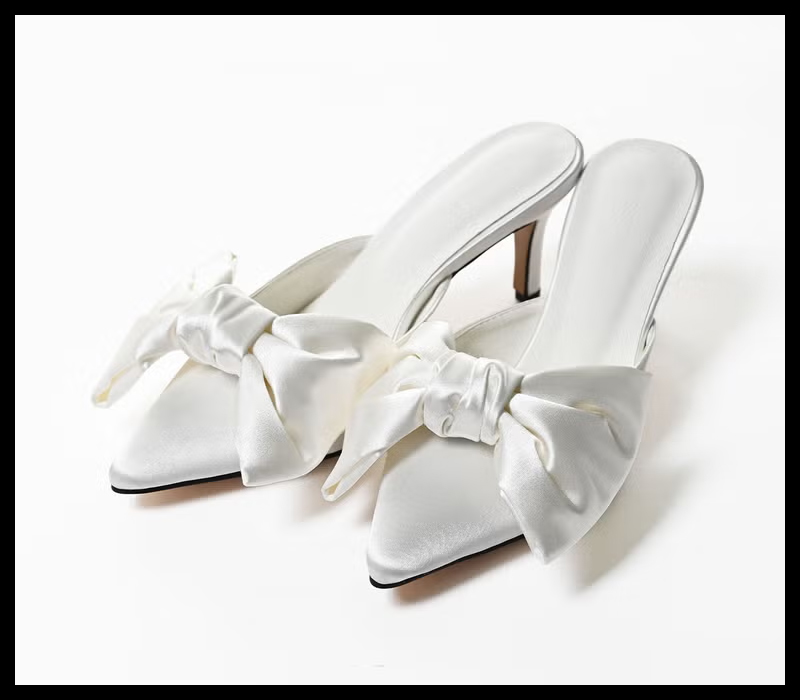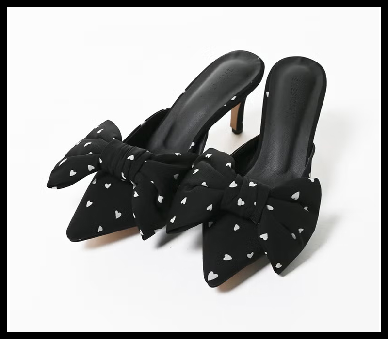 立体感のあるビッグリボンが目を惹くポインテッドミュール。無地の上品なサテンと、遊び心のあるハート柄の2タイプ展開で、足元からスタイリングを華やかに演出します。
