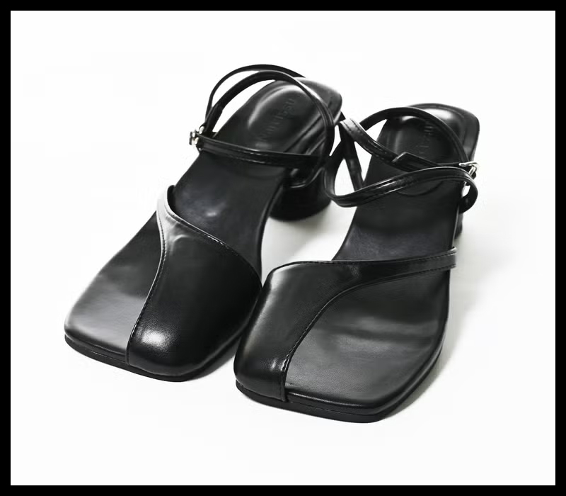 シンプルながらも洗練された印象を与える、ミニマルデザインのストラップサンダル。シャープなスクエアトゥに、アンバランスなアッパーデザインが特徴的。履くだけでスタイリング全体をモードに引き上げてくれる1足。