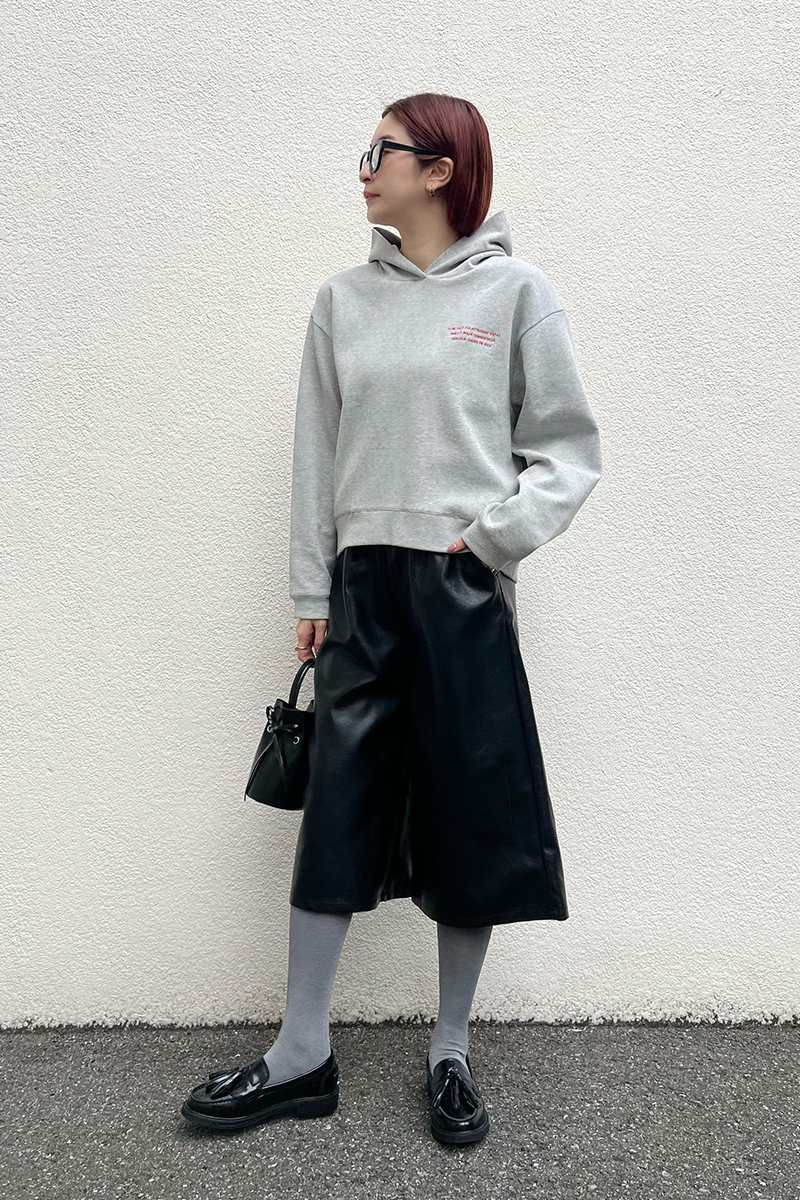 グレー×ブラックのワントーンコーデ。ハーフ丈のワイドレザーパンツを合わせ、こなれ感のあるクールスタイルに。ダンボール素材の程よいハリ感がレザーの重さを中和し、抜け感のある大人バランスを演出します。足元はタッセルローファーで引き締め、カジュアルながらも洗練された着こなしに。