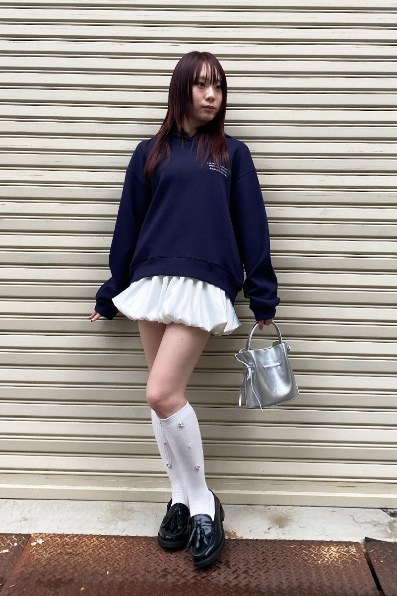 サテンのバルーンミニスカートとソックス合わせで、フェミニンムードを引き立てたコーディネート。ハリ感のあるダンボール素材がシルエットをきれいに保ち、甘さの中にも洗練された印象をプラスします。足元はローファーで程よく引き締めるのがポイント。